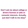 Don't ask me about college or drivers licenses or jobs or romantic interests. Actually, just don't talk to me okay?